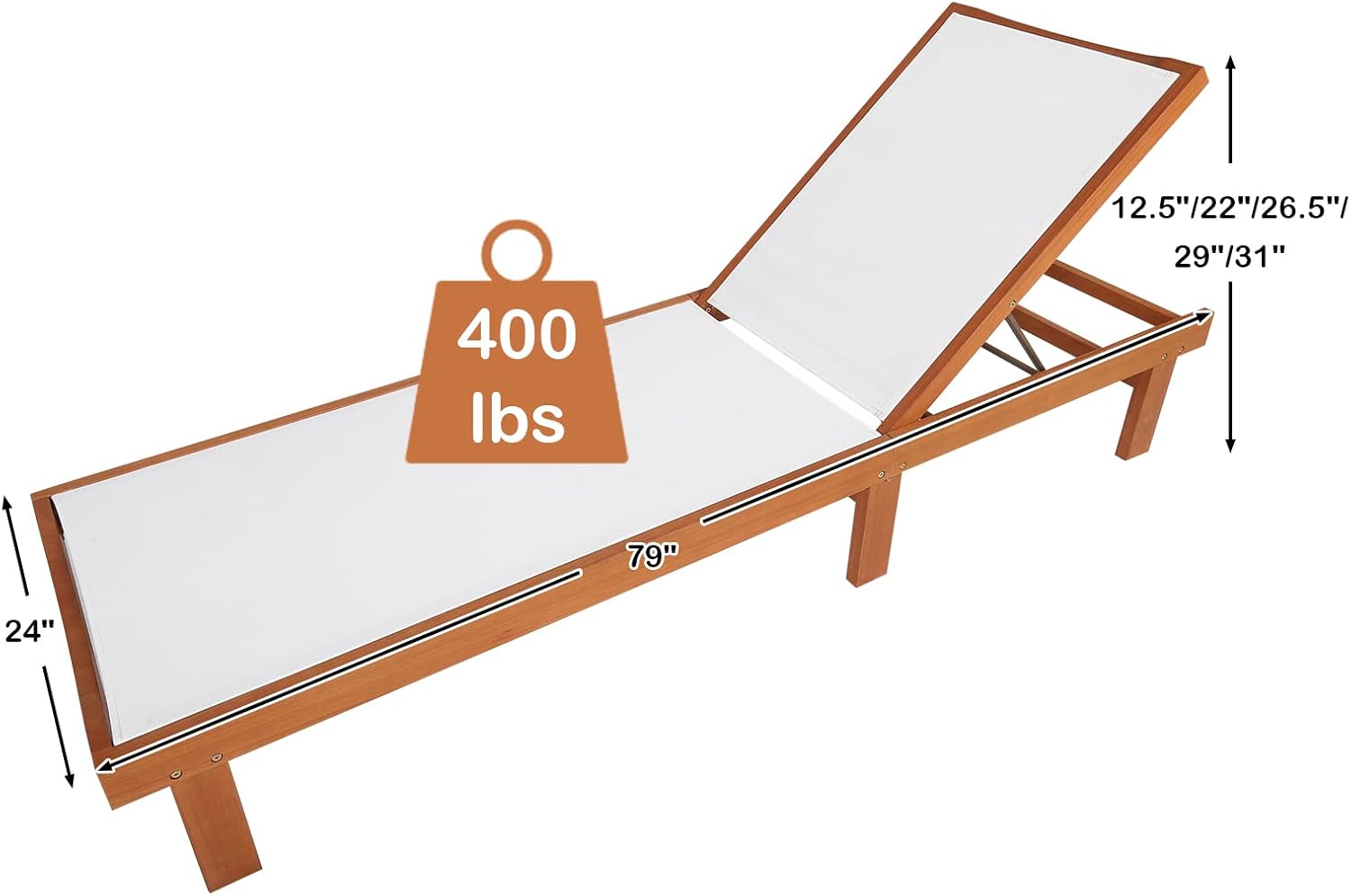 COSTWAY Patio Wood Chaise Lounge Chair, Strong Eucalyptus Wood Frame, 5-Position Adjustable Outdoor Recliner with White Mesh (2)