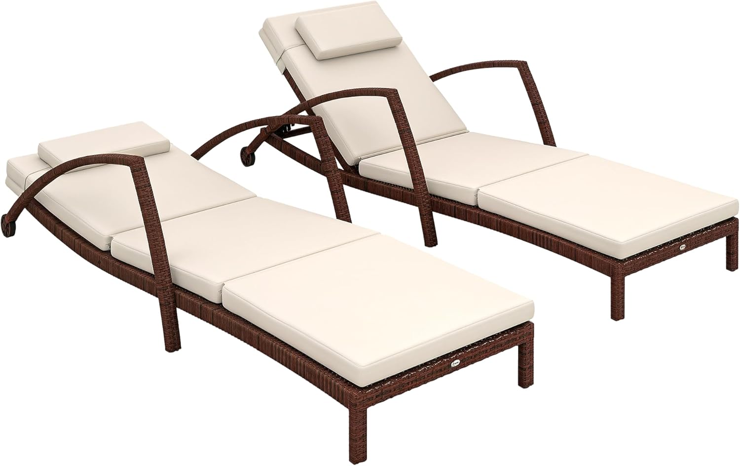 Outsunny Wicker Chaise Lounge Chair Outdoor Set of 2, 5-Position Adjustable Reclining Pool Lounge Chairs with Wheels, Rattan Outdoor Lounger with Cushion, Armrests for Poolside Beach Backyard, Beige
